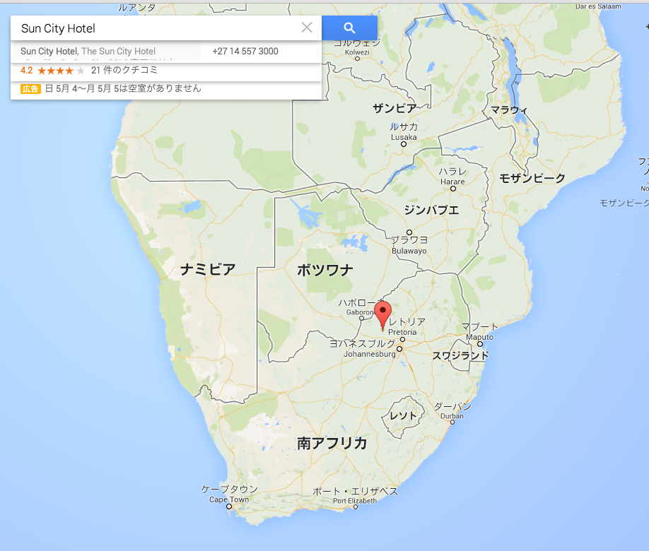ヨハネスブルグやプロテリアから約2時間。ロシア系移民のソル・カーズナー(Sol Kerzner)が1974年に、作った白人専用リゾート。何しろ、何もない所に巨大なホテル・リゾートが登場するから驚く!