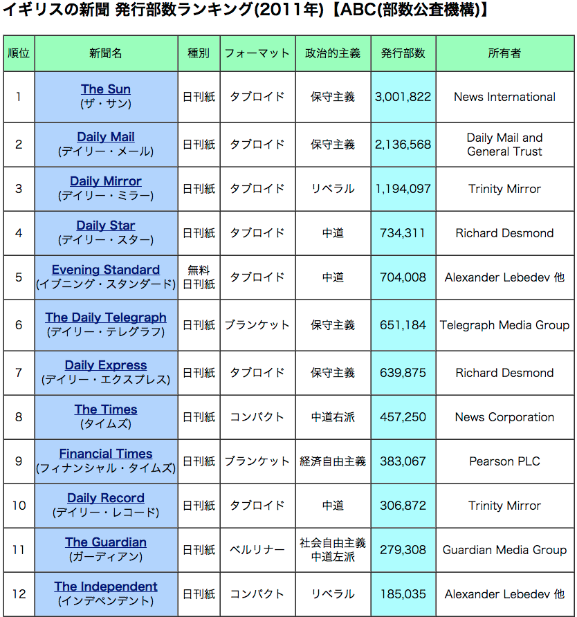 英国の新聞 2011年