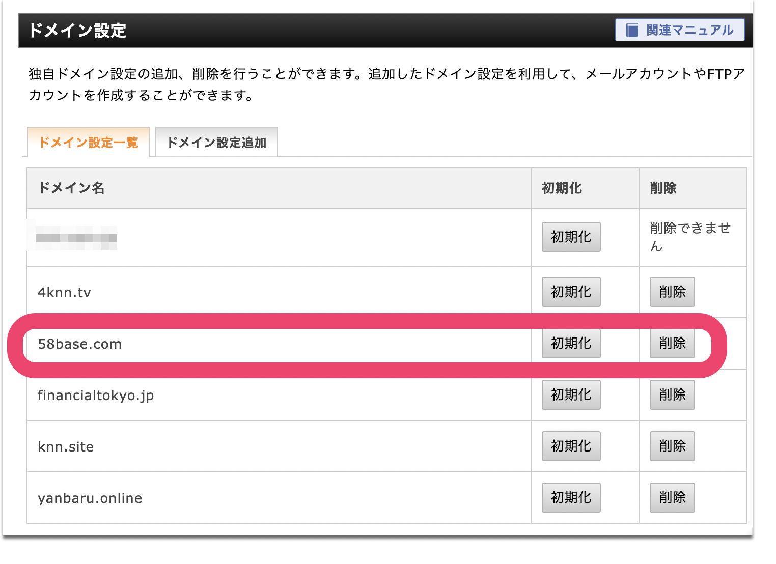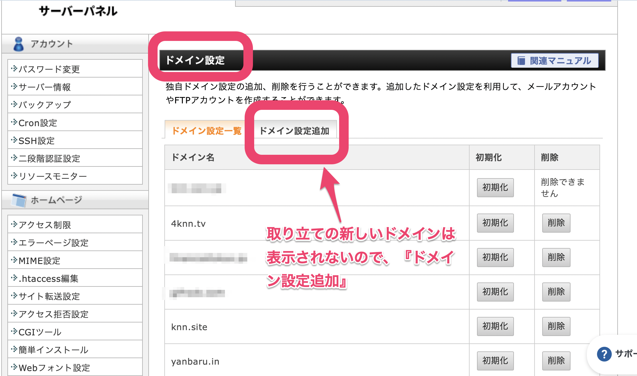 隠れているタブの『ドメイン設定追加』を選ぶ…。