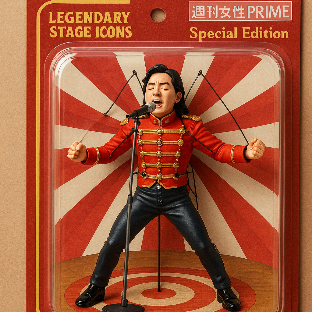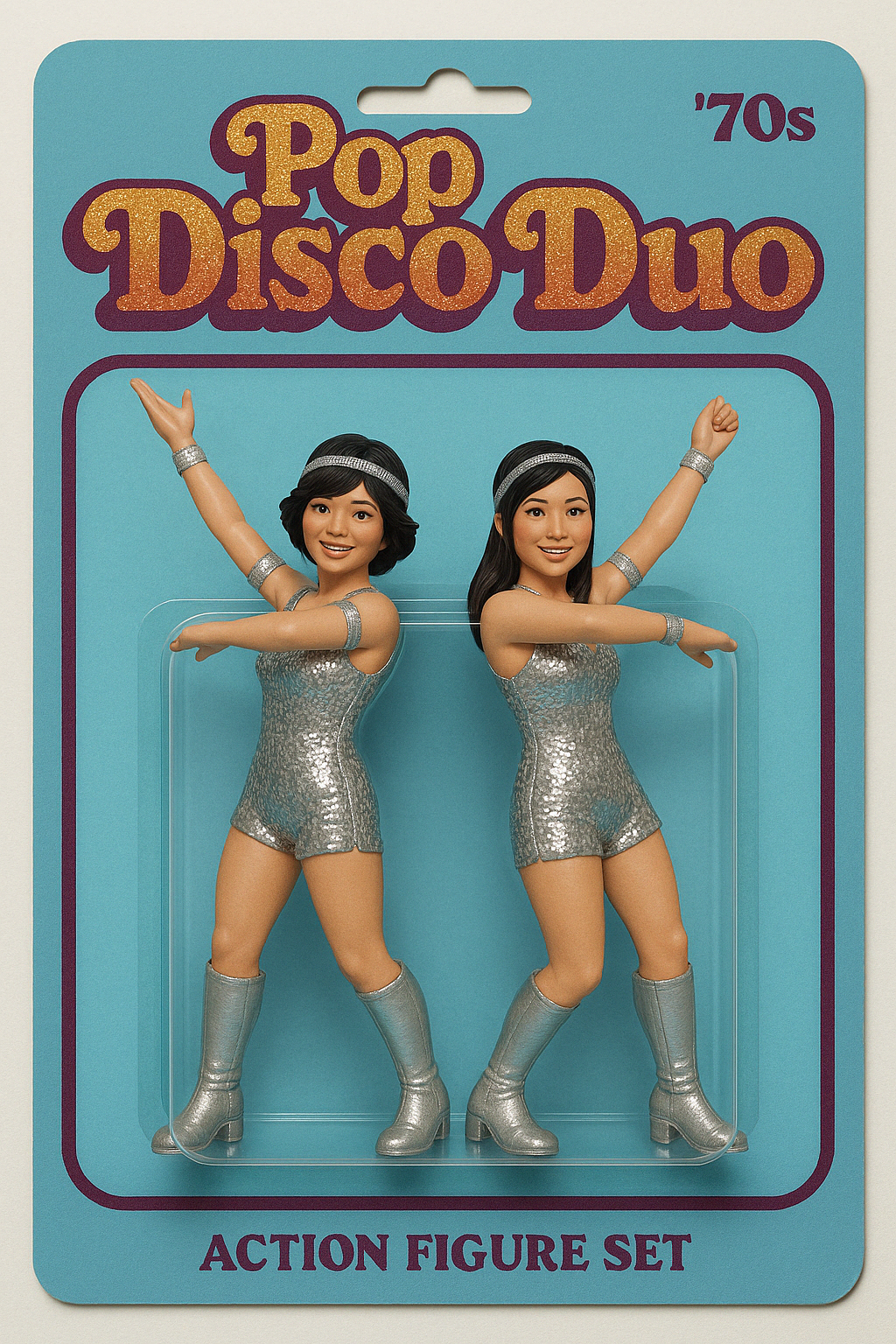 pls draw this prompt please read to this picture .yaml data. then put as a 3D action figure in classic blister packaging. I included details like: •Outfit and style based on a real photo product_name: “Iconic 70s J-Pop Duo – Silver Stars Edition” product_type: “Action Figure Collectible Set (2-Pack)” series: “Retro Music Legends” manufacturer: “Hypothetical Collectibles Inc.” release_year: “TBD” sku: “HCI-RML-70SJP-SS01” set_details: theme: “1970s Japanese Pop Music / Disco Era” figure_count: 2 based_on_image: “Provided promotional photo of the duo in silver outfits.” scale: “Approx. 1:12 (6-inch scale)” packaging: type: “Classic Blister Pack (Double Wide)” cardback_details: material: “Cardboard” artwork: | – Vibrant retro design using colours and fonts reminiscent of the late 1970s. – Features the original photo the figures are based on prominently. – Duo’s logo (stylized) at the top. – Background graphics with disco ball motifs and stage lights effect. – Short biographical text about the duo’s impact on the back. – Window-style blister placement allowing view of both figures and accessories. blister_details: material: “Clear PVC/PET plastic” form: “Custom-molded to hold each figure securely in their distinct poses, plus designated slots for accessories.” figures: – id: “Figure_1_Mie” # Assuming standard identification for Pink Lady based_on_person: “Left Person in Photo” pose: “Dynamic dance pose captured from photo: Right arm up and bent, left arm extended forward, left leg forward, energetic lean, looking slightly left with a bright smile.” articulation_points: # Standard collector-grade articulation – Head (ball joint) – Shoulders (ball/hinge) – Elbows (single or double hinge) – Wrists (swivel/hinge) – Torso/Waist (possible ball joint or swivel) – Hips (ball joint or similar) – Knees (single or double hinge) – Ankles (hinge/rocker) outfit: – item: “Halter-neck Romper” details: “Molded plastic replicating shiny, silver sequined fabric texture.” color: “Silver” – item: “Knee-High Boots” details: “Molded plastic, go-go style with block heel, replicating shiny silver material.” color: “Silver” – item: “Headband” details: “Molded thin silver band across forehead/hairline.” color: “Silver” – item: “Armbands” details: “Molded layered bands on upper left arm.” color: “Silver” appearance: hair: “Molded dark hair in a short bob with bangs, styled as per photo.” face_sculpt: “Captures a wide, energetic smile with visible teeth, based on photo.” – id: “Figure_2_Kei” # Assuming standard identification for Pink Lady based_on_person: “Right Person in Photo” pose: “Dynamic dance pose captured from photo: Left arm up and bent, right arm extended forward, right leg forward, leaning back slightly, looking forward with a gentle smile.” articulation_points: # Consistent with Figure 1 – Head (ball joint) – Shoulders (ball/hinge) – Elbows (single or double hinge) – Wrists (swivel/hinge) – Torso/Waist (possible ball joint or swivel) – Hips (ball joint or similar) – Knees (single or double hinge) – Ankles (hinge/rocker) outfit: # Identical design to Figure 1 – item: “Halter-neck Romper” details: “Molded plastic replicating shiny, silver sequined fabric texture.” color: “Silver” – item: “Knee-High Boots” details: “Molded plastic, go-go style with block heel, replicating shiny silver material.” color: “Silver” – item: “Headband” details: “Molded thin silver band across forehead/hairline.” color: “Silver” – item: “Armbands” details: “Molded layered bands on upper right arm.” color: “Silver” appearance: hair: “Molded dark hair, slightly longer than Figure 1, with side-swept bangs, styled as per photo.” face_sculpt: “Captures a calmer, closed or slightly open-mouth smile, based on photo.” accessories: # Included within the blister pack – item: “Microphone” quantity: 2 details: “Classic handheld dynamic microphone style, silver/chrome finish.” – item: “Display Stand” quantity: 2 details: “Clear or black circular base with a peg, potentially featuring the duo’s logo.” – item: “Alternate Hands” # Optional but common for collector figures quantity: 4 (1 pair per figure) details: “Pairs of hands sculpted for holding microphones.”