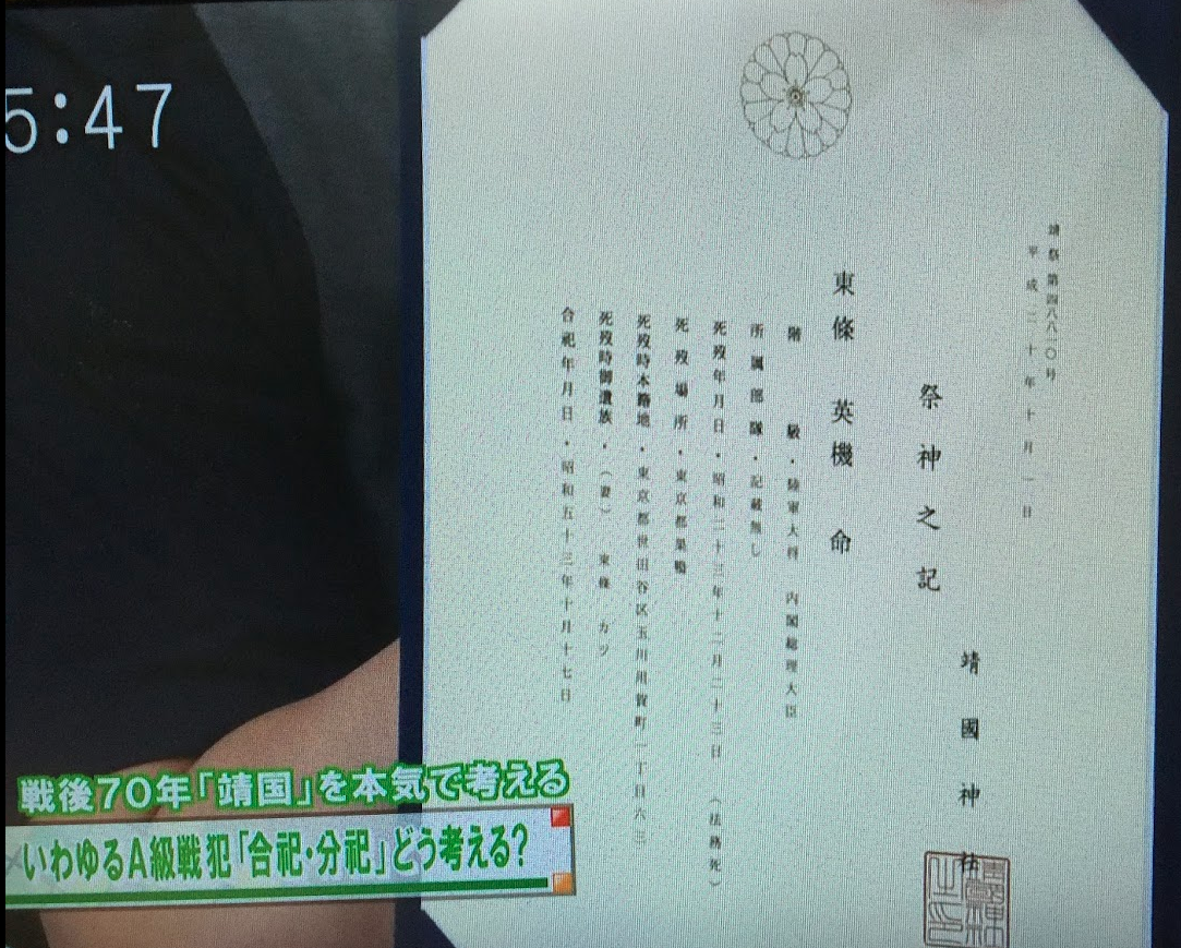 しかし、東條英樹のひ孫さんは靖国神社に祀られている証明証をテレビで初公開された。