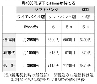 ❏学生やスマホを初めて使う高齢者などが利用しやすくなりそうだ。 ワイモバイル店の契約増につなげる(都内店舗) 旧機種の「iPhone5s」を全国約1000カ所のワイモバイル店とウェブサイトで販売する。データ容量16ギガ(ギガは10億)バイトの端末で2年間の新規契約をする場合、通信料と端末代の合計が月3980円となり、ソフトバンク店で最新の「6s」を契約した場合の半額程度となる。